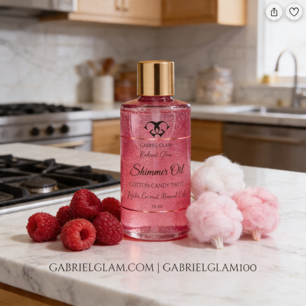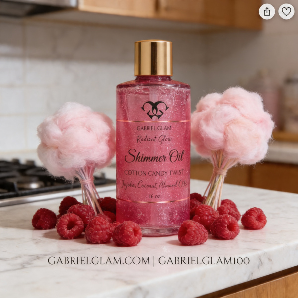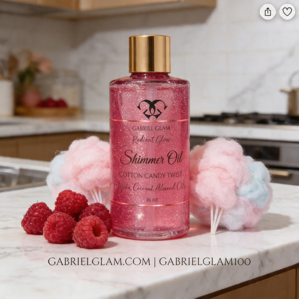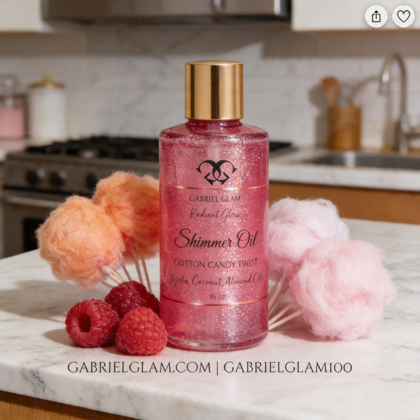 Apply the Radiant Glow Cotton Candy Twist Shimmer Oil for a radiant Glam-N-Glow look. The shimmer oil is made with Sweet Almond Oil, Jojoba Oil, Vitamin E, Coconut Oil, Shea Butter, Mica, and the heavenly fragrance of cotton candy and raspberries.
