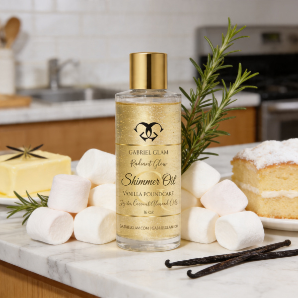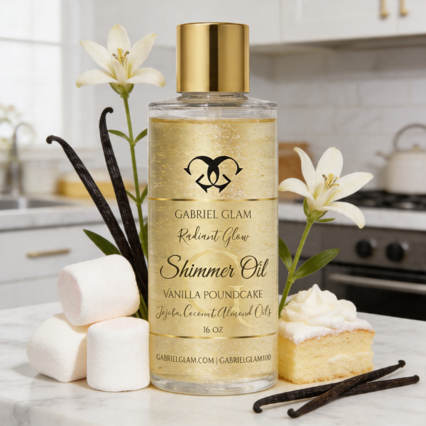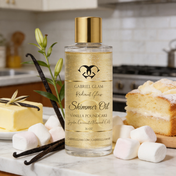 Radiant Glow Vanilla Pound Cake Shimmer Oil for a radiant Glam-N-Glow look. Made with Sweet Almond Oil, Jojoba Oil, Vitamin E, Coconut Oil, Shea Butter, Mica and heavenly fragrance of vanilla pound cake.